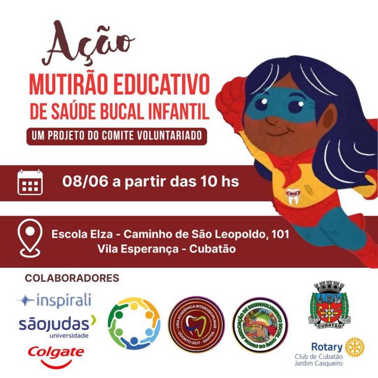 Neste domingo 8 de junho de 2025, o Rotary Club de Cubatão Jardim Casqueiro participou da Ação Mutirão Educacional da Saúde Bucal Infantil, promovida pelo Comitê de Voluntários da Universidade São Judas Tadeu. O evento contou com a parceria da Liga Acadêmica Interdisciplinar Odonto USJT, Inspirale, Colgate, Prefeitura Municipal de Cubatão Rotary Club de Cubatão Jardim Casqueiro e da Associação de Desenvolvimento Social Morro do Índio.