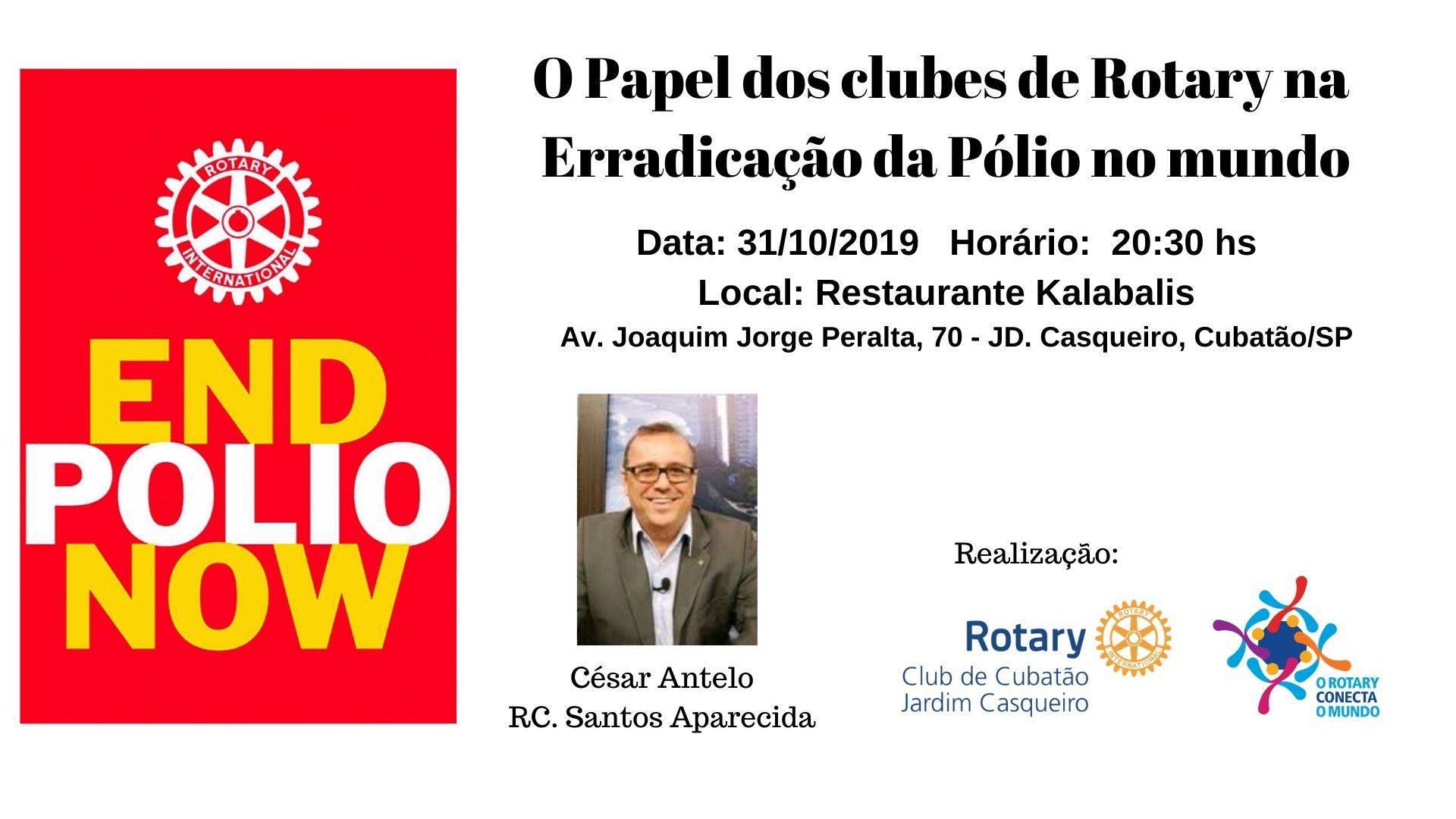 O Rotary club de Cubatão Jd. Casqueiro convida a todos para a Palestra do companheiro César Antelo, do Rotary Club Santos Aparecida que falará sobre "O Papel dos Clubes de Rotary na Erradicação da Pólio no Mundo"